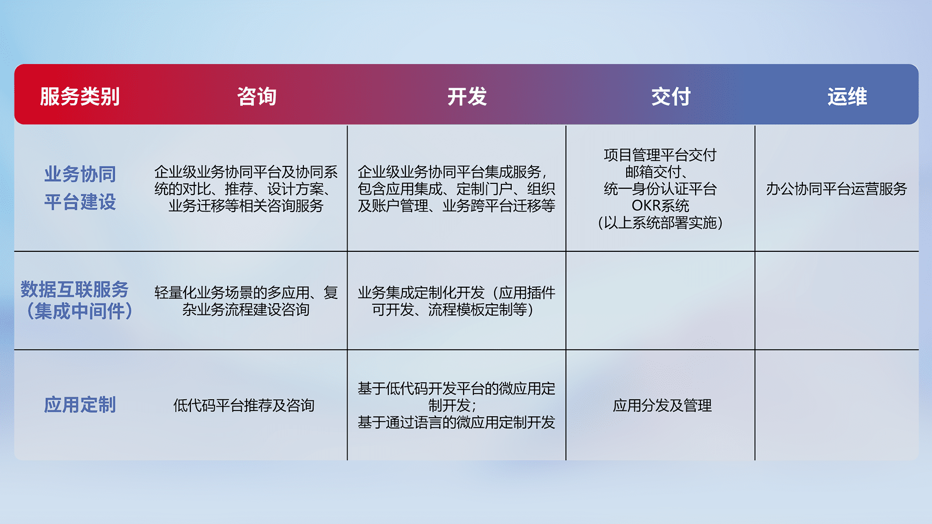 针对钉钉、、企微、、IDaas等平台级产品提供产品的规划、、、方案、、、交付、、、定制化开发等服务,,,,实现如统一协同办公、、智能客户服务、、混合会议管理、、、、智能数据查询、、、、等业务场景,,,,实现数字化转型。。。