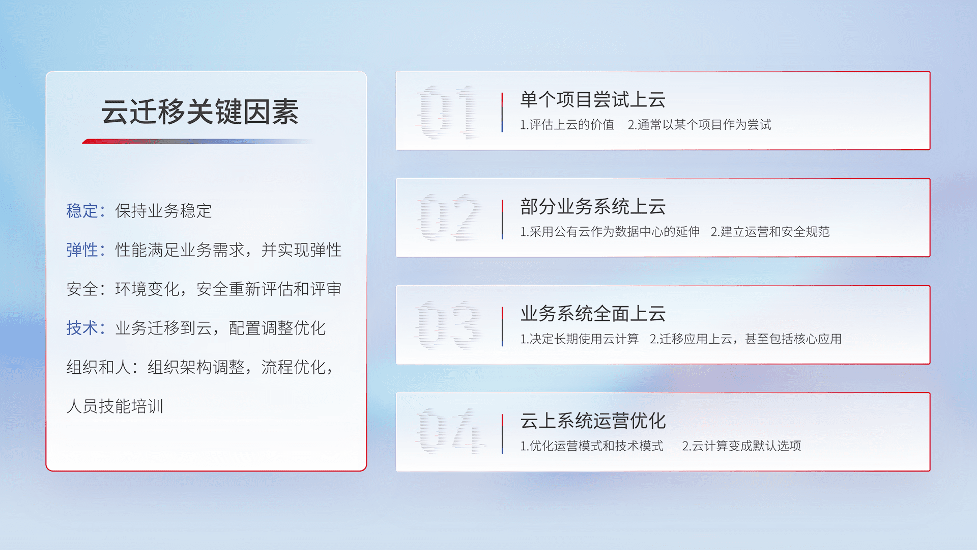 结合实际业务,,,,从规划设计、、云平台选型、、云原生改造、、、数据迁移、、集成交付,,,,迁移全过程为客户识别最佳上云路径,,做好风险识别管理,,,,设计网络架构、、、身份权限、、、安全审计合规、、、操作审计、、、日志审计、、、、监控告警策略、、、、多站点容灾设计等,,,对云上基础设施进行整体规划,,,,提升IT治理水平,,,,以满足弹性、、高可用、、高性能的需求。。。