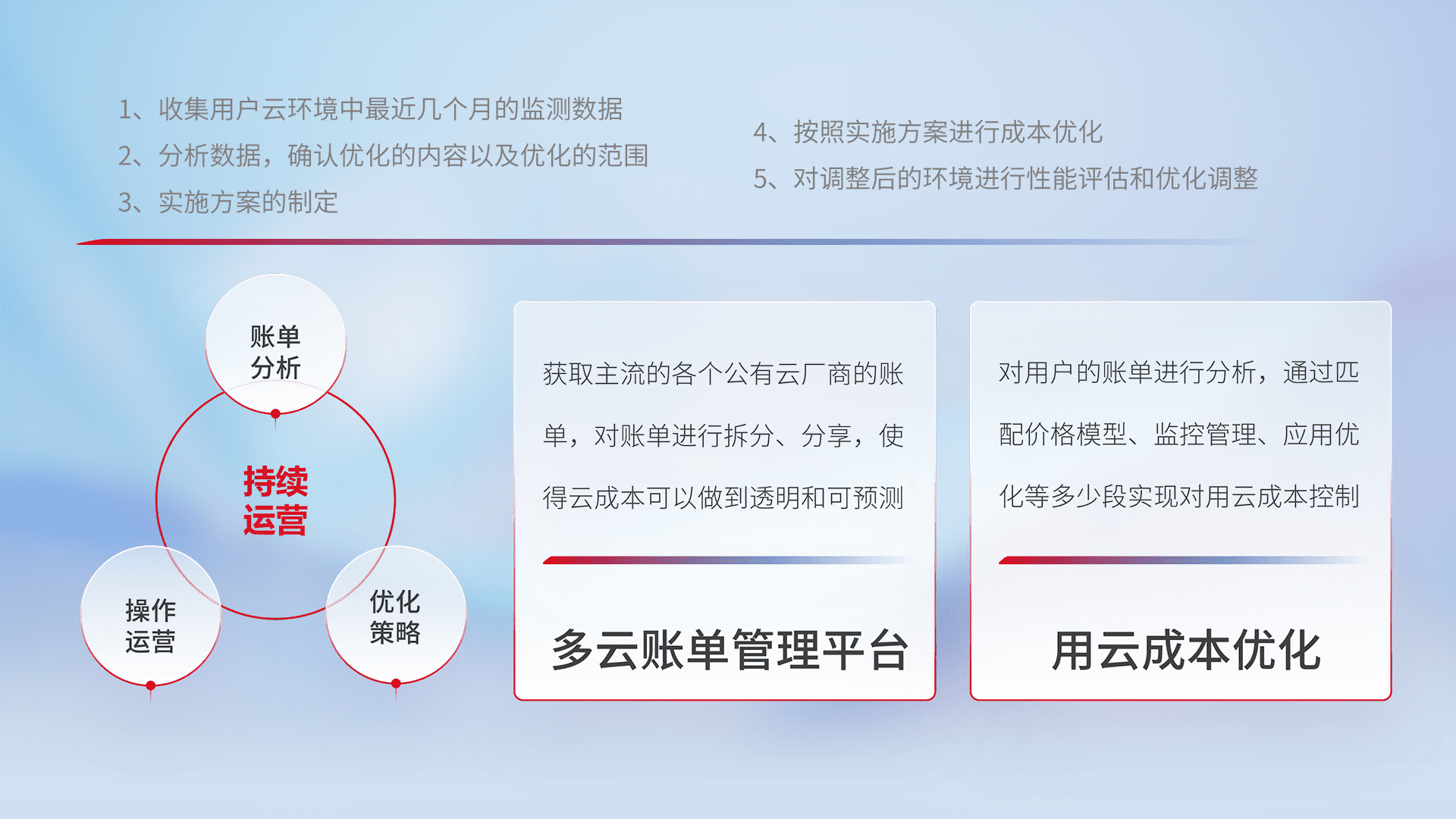 通过多云纳管,,以统一的资源数据模型把客户的云资源进行抽象和封装,,进而实现对多云资源的统一操作,,,,保障云资源管理的可靠性、、、稳定性与可用性。。。。量身定制化运维内容,,配置、、开发运维、、、、补丁管理、、、、备份、、监控、、、、认证和访问管理、、审计和日常巡检等,,保障在用云过程中的可靠度,,,稳定度以及高可用率。。